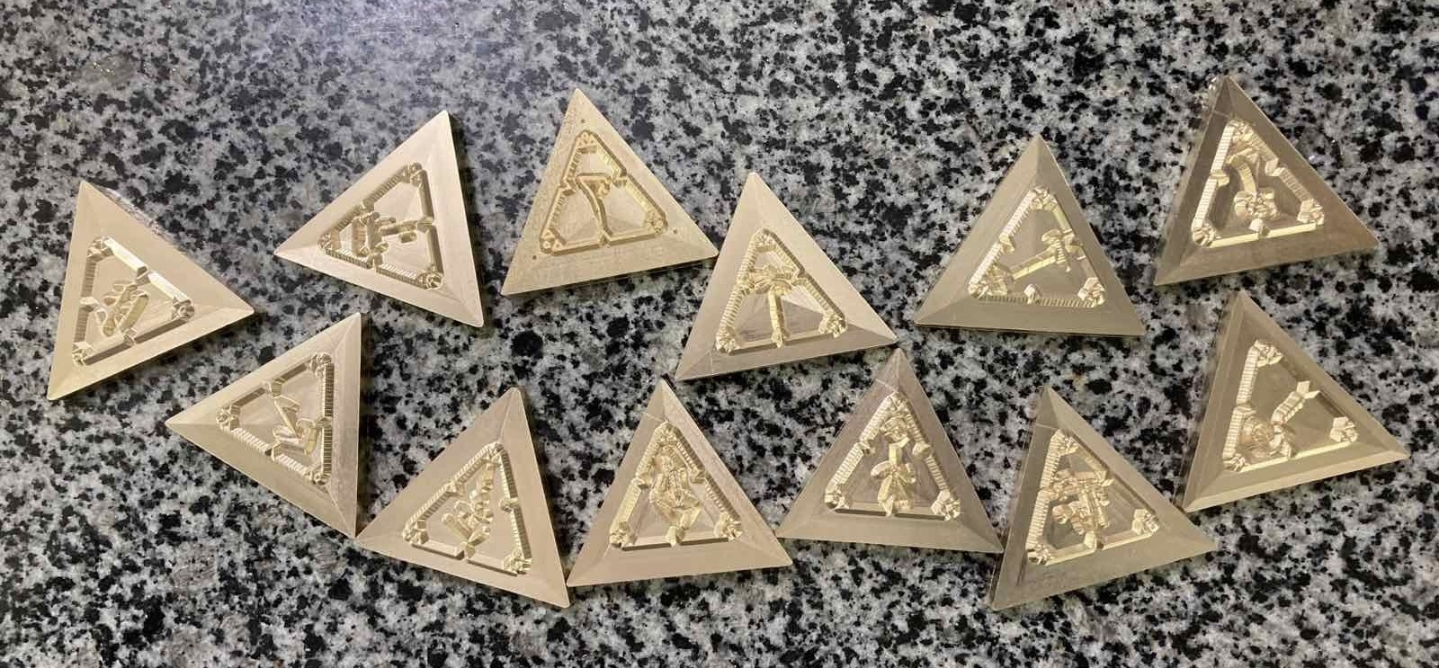 The set consists of geometric triangular dies containing rune-inspired symbols.